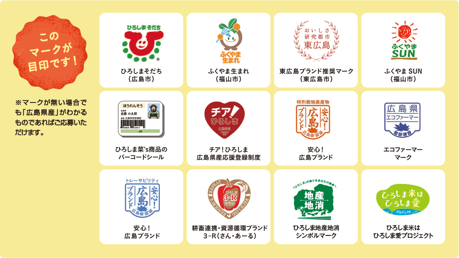 広島県産農林水産物を300円(税込)以上ご購入!下記の広島県の地産地消マークが目印です。